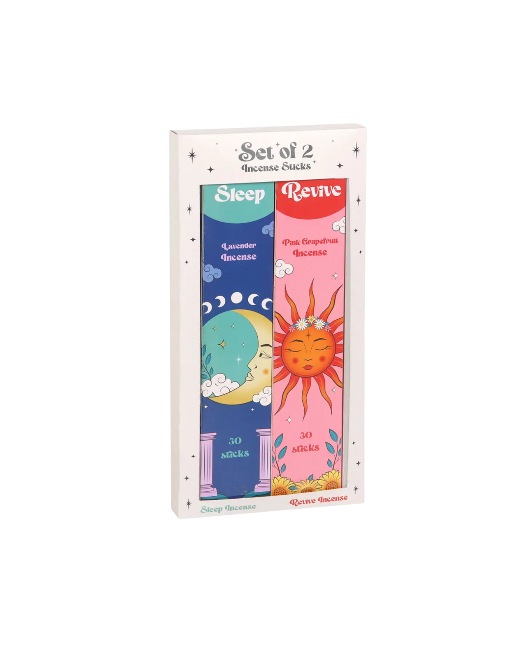 Sold as a set of two, 30 sticks of Sleep (lavender) and 30 sticks of Revive (pink grapefruit).