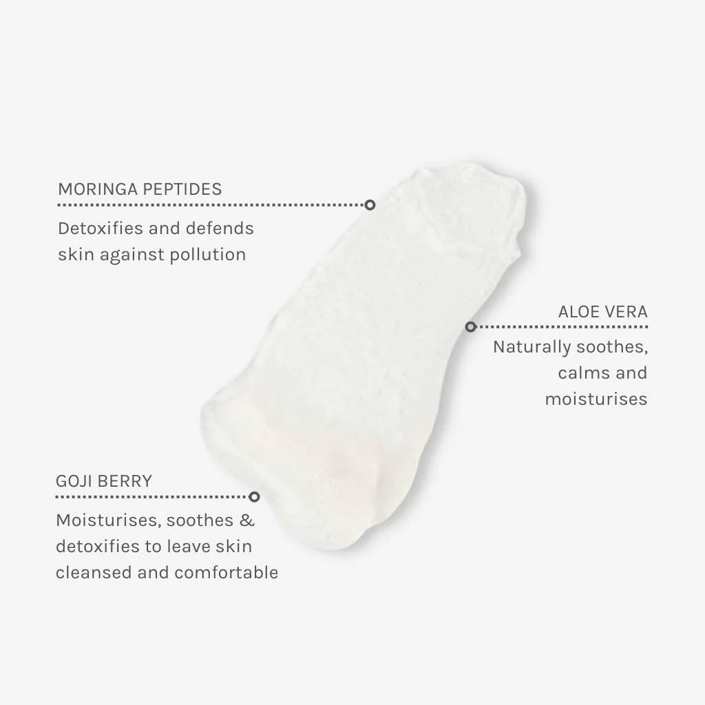 Aqua (Water), Cocamidopropyl Betaine, Sodium Coco-Sulfate, Lauryl Glucoside, Coco-Glucoside, Glyceryl Oleate, Glycerin**, Gluconolactone, Parfum (Naturally derived fragrance), Aloe Barbadensis Leaf Juice Powder*, Lycium Barbarum (Goji Berry) Fruit Extract*, Moringa Pterygosperma Seed Extract, Sodium benzoate, Calcium Gluconate, Dextrin, Arginine, Citric Acid, Hydrogenated Palm Glycerides Citrate, Tocopherol, Limonene, Linalool. *Ingredients from Organic farming