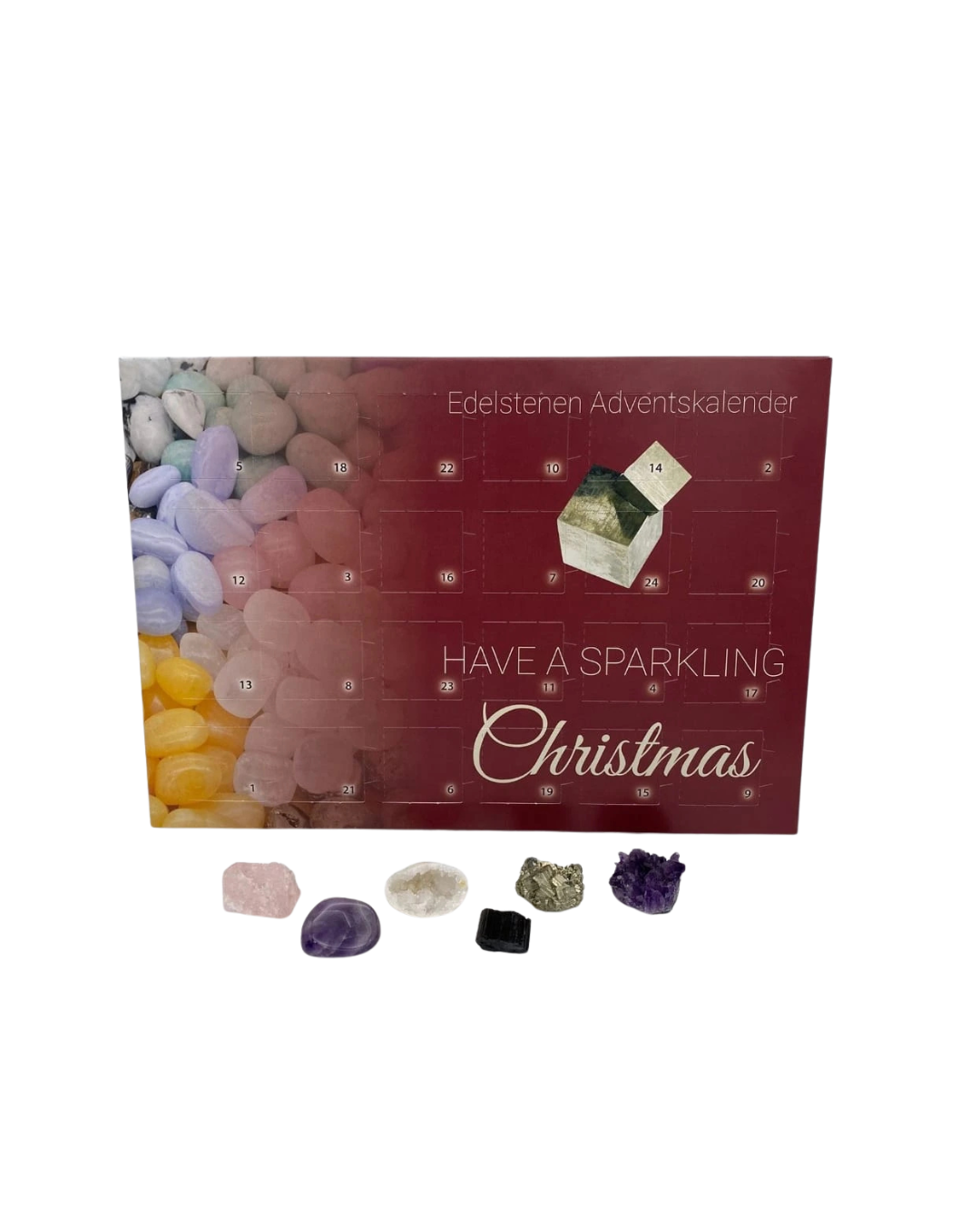 The calendar has been carefully filled with 100% real A quality gemstones. On the back you will find an overview of those. Each gemstone has a short description. And it gets even cooler: it even contains a real mosasaur tooth! Enjoy the magic of this beautiful and unique Advent Calendar.