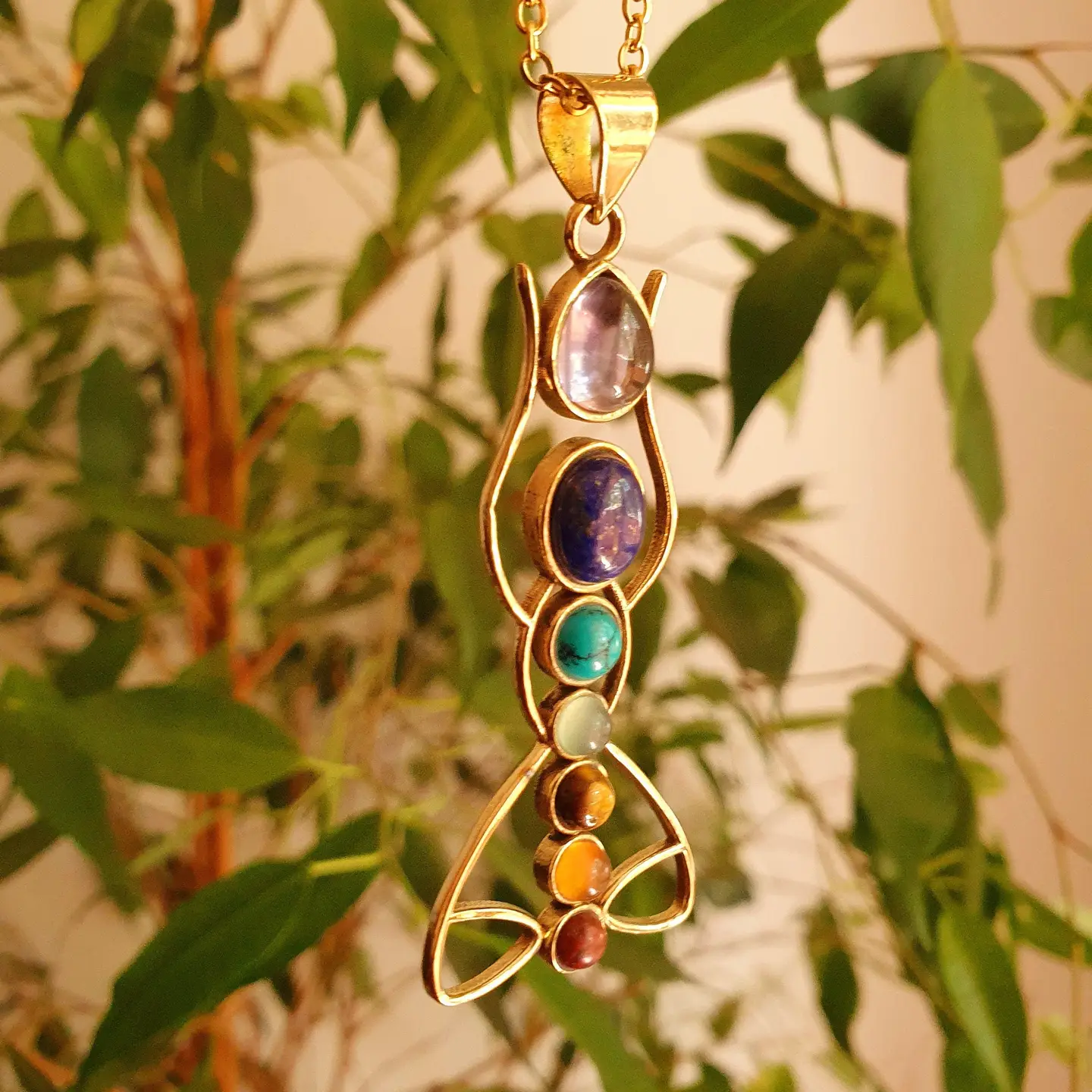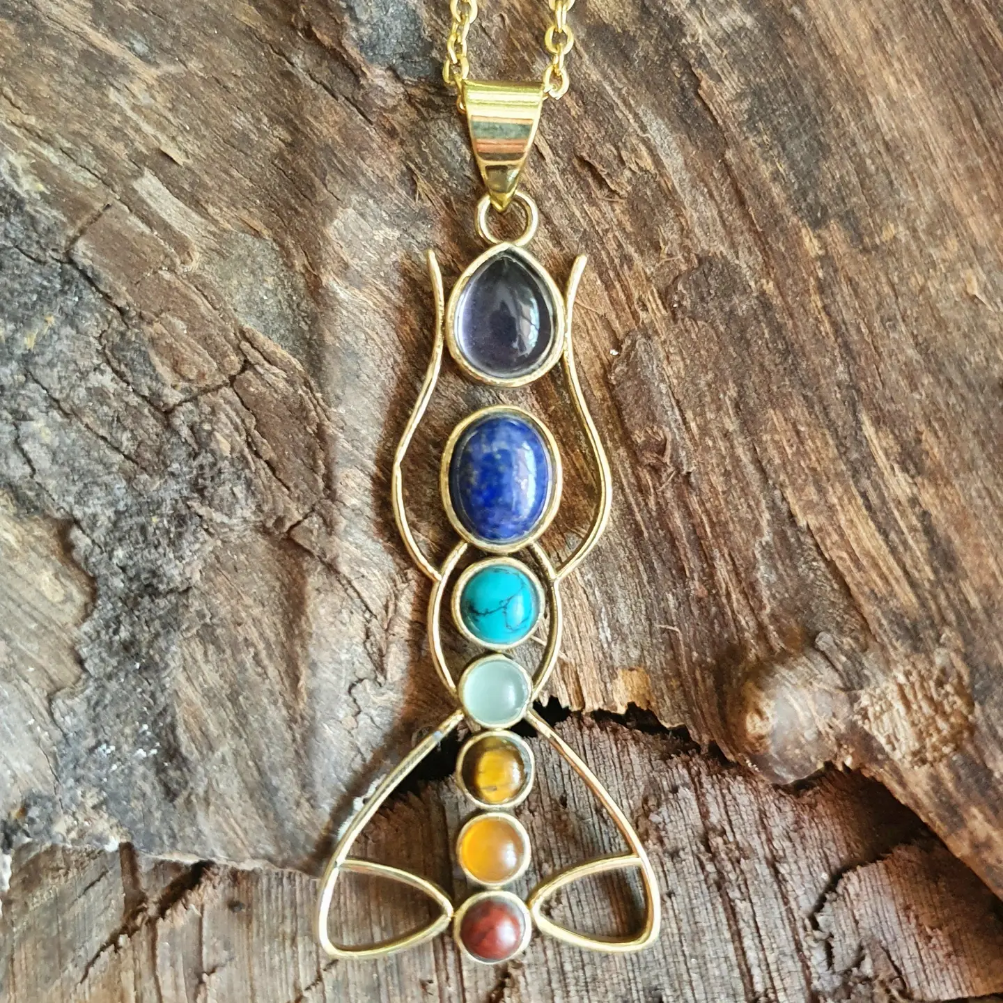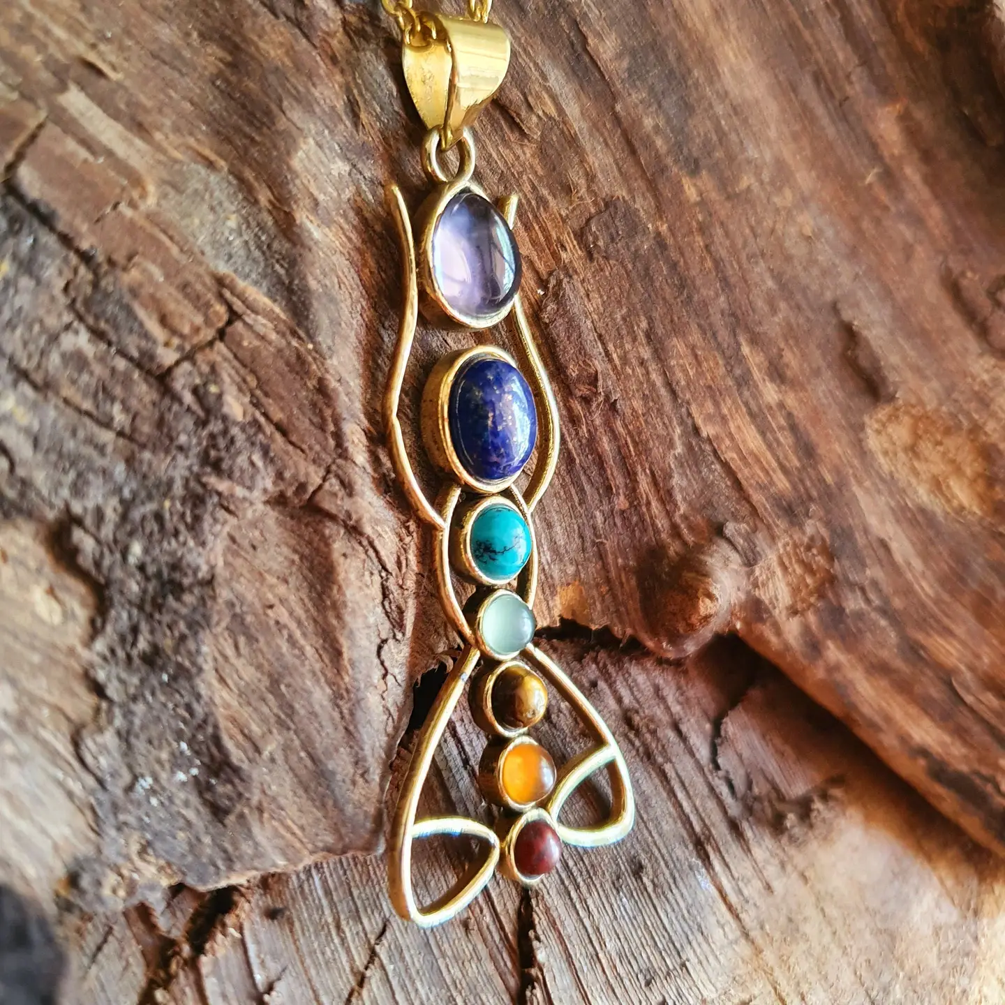 Golden Seven Chakras necklace on hypoallergenic stainless steel chain. Chakras refer to various energy centers in your body that correspond to specific nerve bundles and internal organs. The seven major chakras run from the base of your spine to the top of your head. If these energy centers get blocked, you may experience physical or emotional symptoms related to a particular chakra.