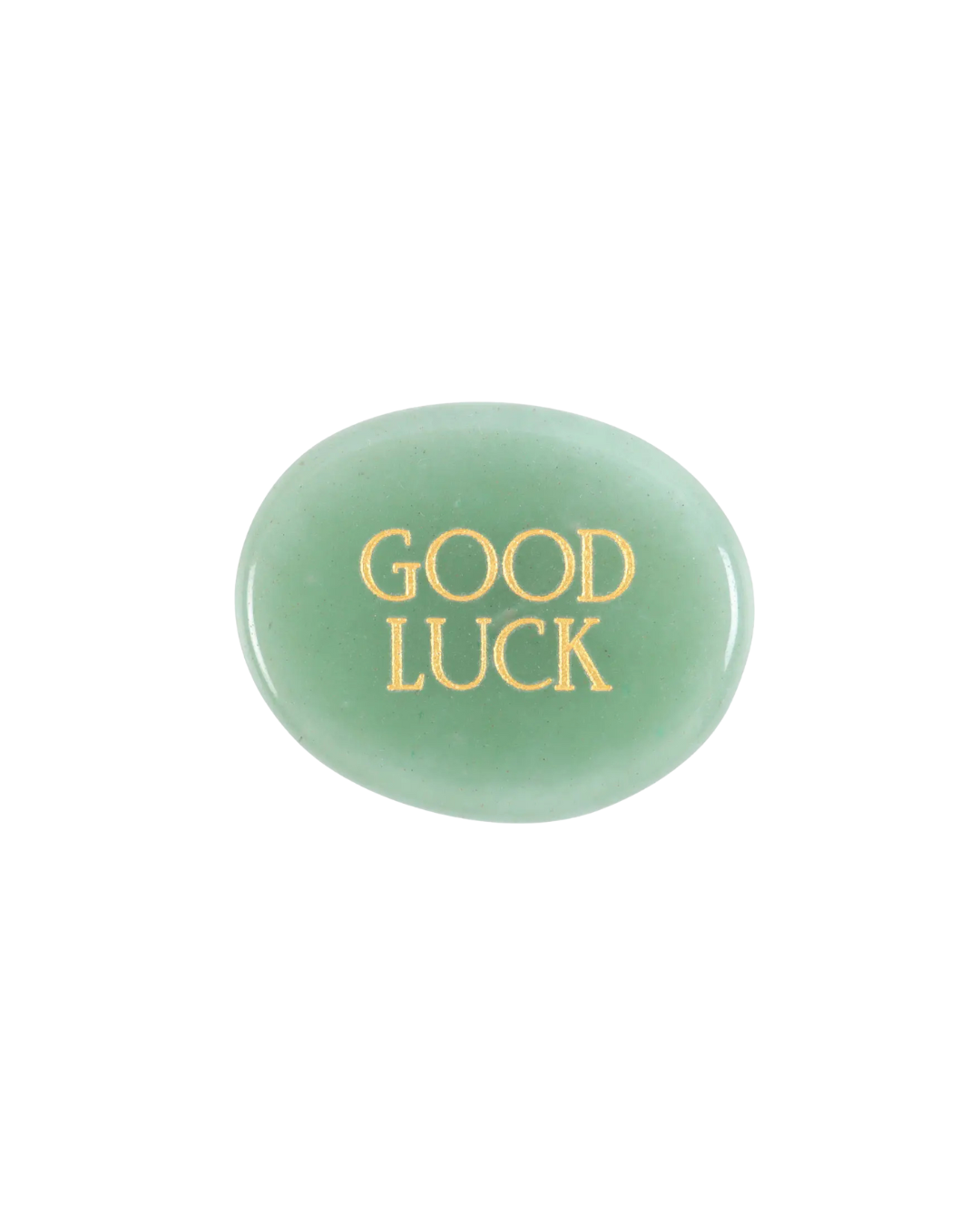 This healing Green Aventurine palm stone is accented with engraved gold-toned “Good Luck” text, making it a meaningful token of positivity. The stone’s prosperous energy enhances its natural healing properties.