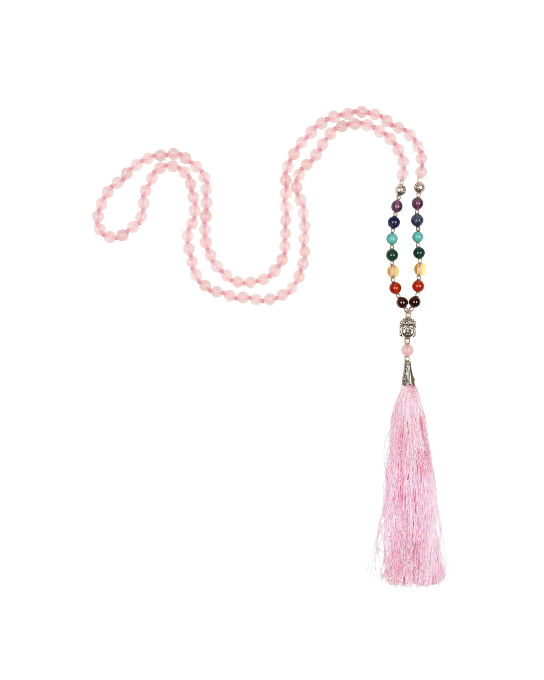 The pretty pink Mala necklace with rose quartz has 7 chakra stones, which symbolize and support the seven energy centers in the body. The Mala is decorated with a pink tassel and a small silver Buddha head. The Mala has 108 individually knotted beads. The diameter of the slightly smaller beads is about 6 mm..