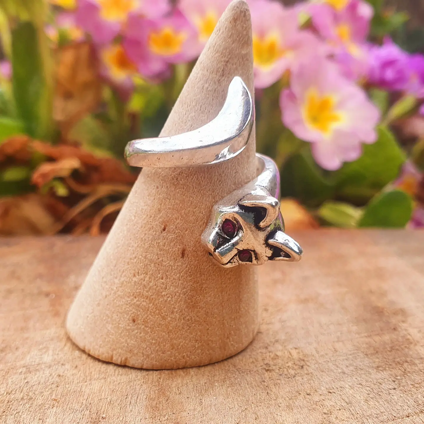 Adorable silver-plated cat ring with a delicate design. Features pink eyes for a playful touch.