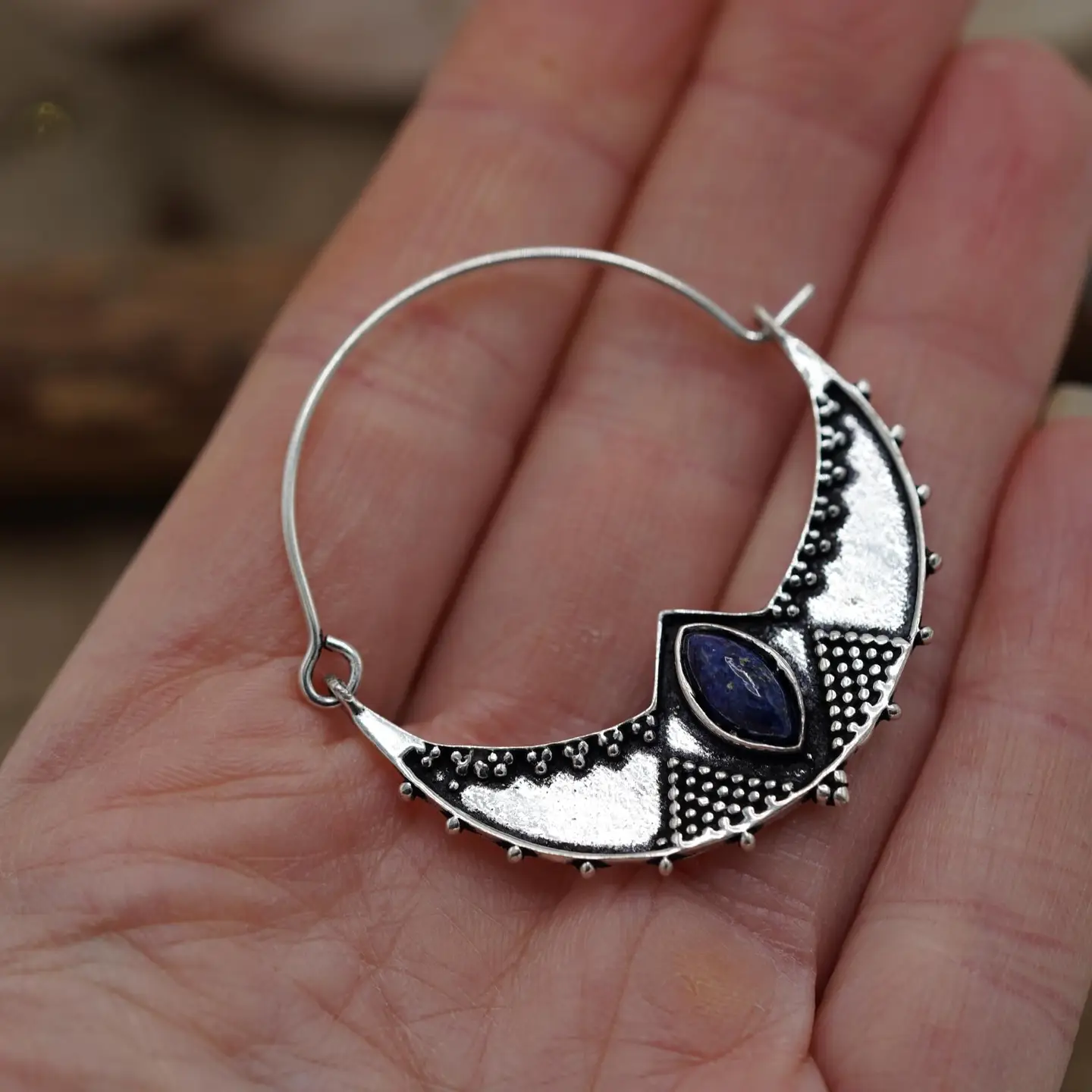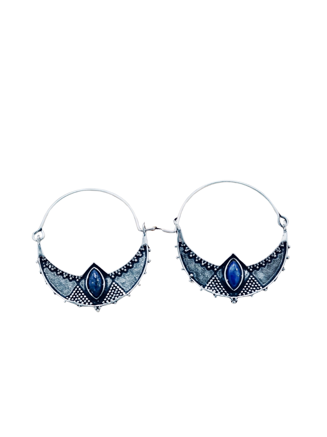 Ethnic Silver Plated Hoop Earrings with Lapis Lazuli stones. These boho brass hoop earrings feature a refined, handcrafted design. Each hoop is adorned with a textured brass crescent, delicately hammered and accented with fine granulated details that add depth and character. At the center, a lapis lazuli stone cut into an elongated teardrop shape brings a touch of deep, luminous blue, creating an elegant contrast with the warm tones of the metal.