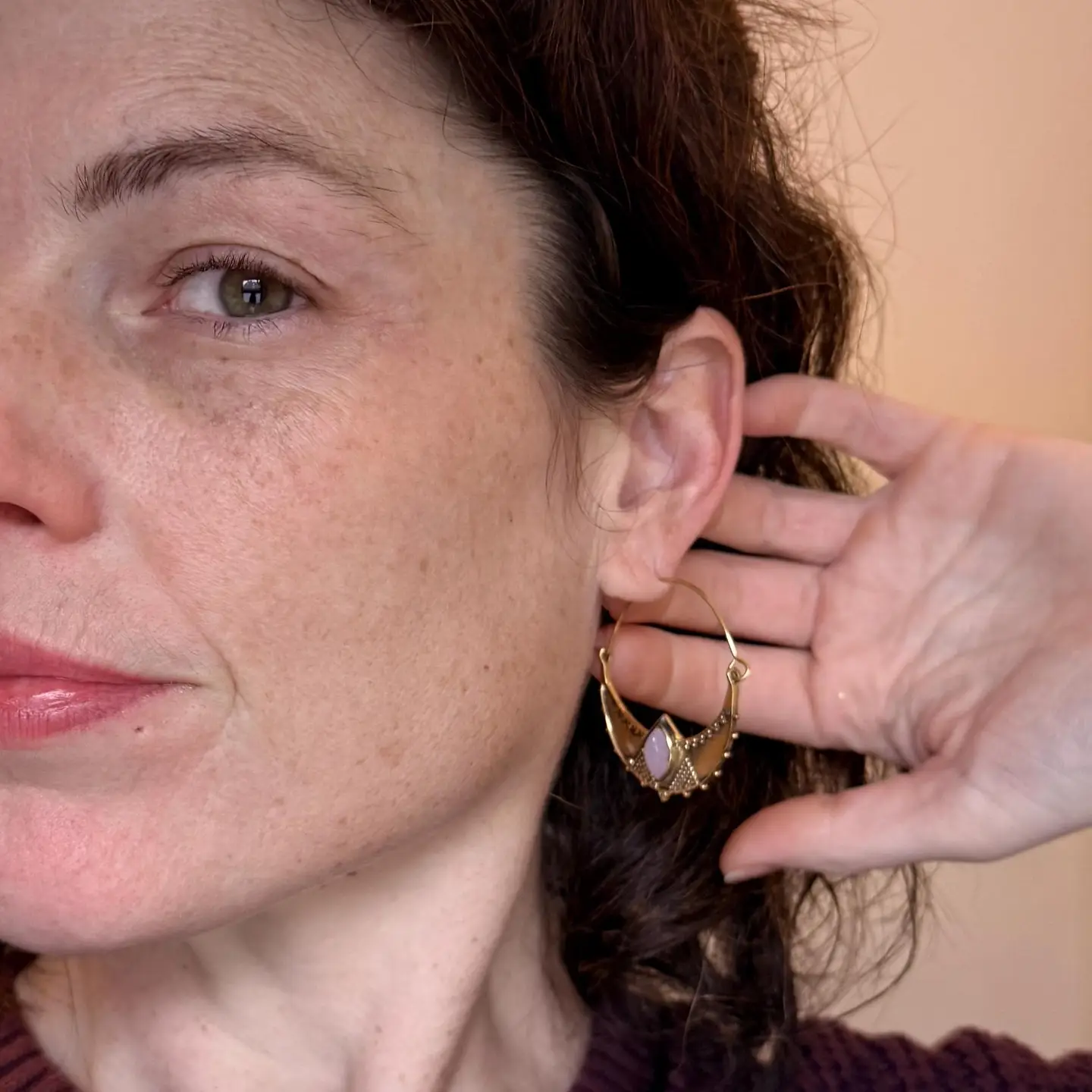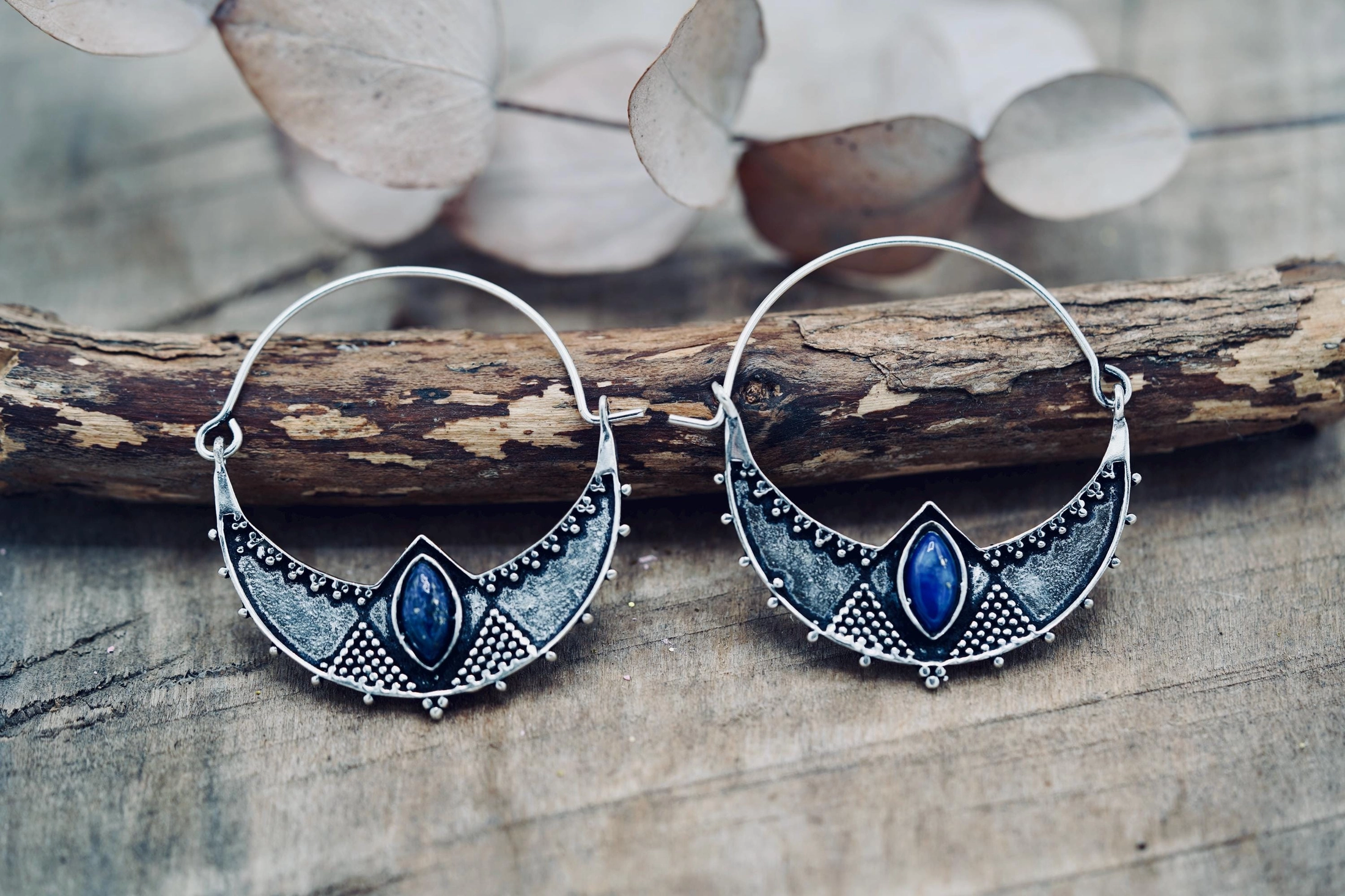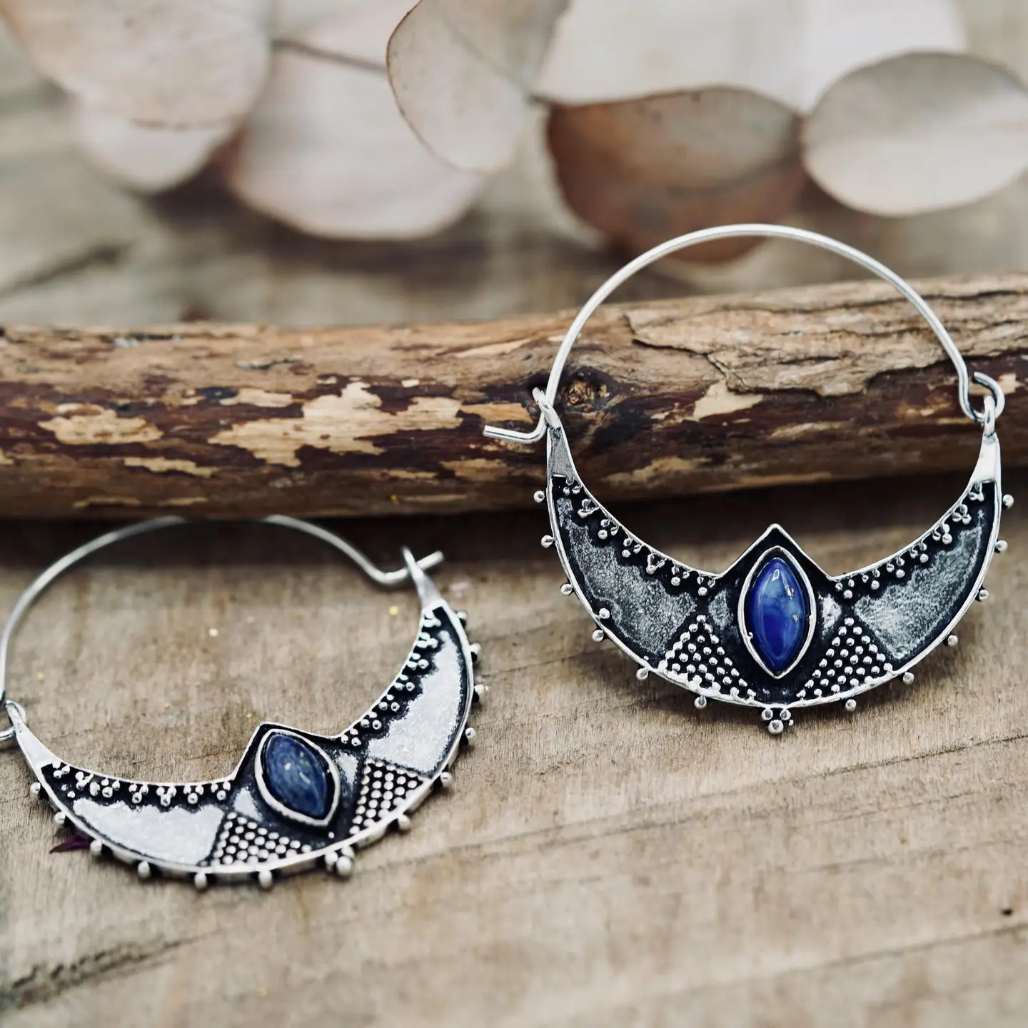 The overall look evokes a solar, ethnic-inspired aesthetic, both natural and sophisticated—perfect for a boho-chic or nomadic style. Silver Plated Brass Hoops with Lapis Lazuli. Lightweight and stunning to wear, approx 4cm x 3.5cm