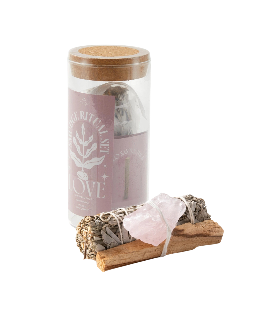 This lovingly crafted set includes a White Sage bundle, a Palo Santo stick, and a raw Rose Quartz crystal, all stored in a reusable glass tube with a cork lid.