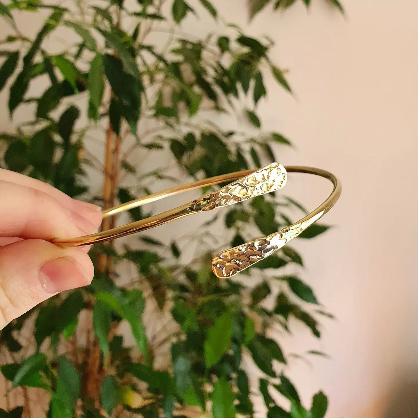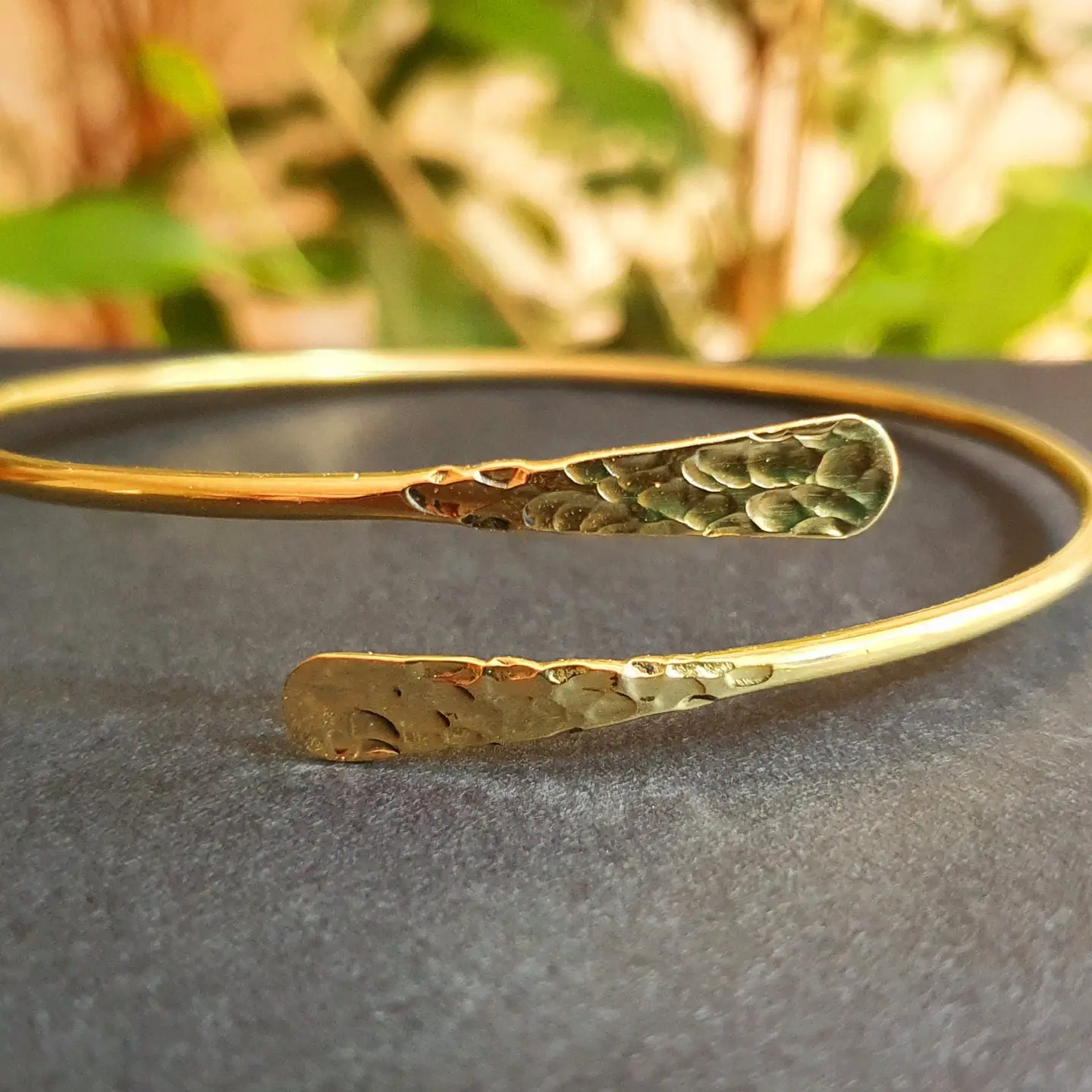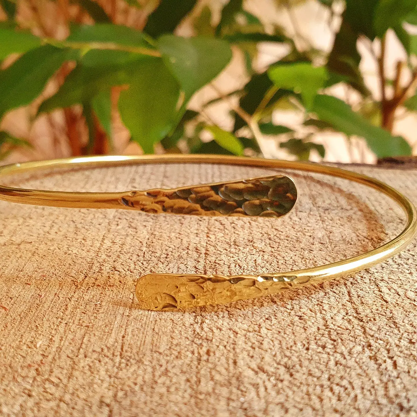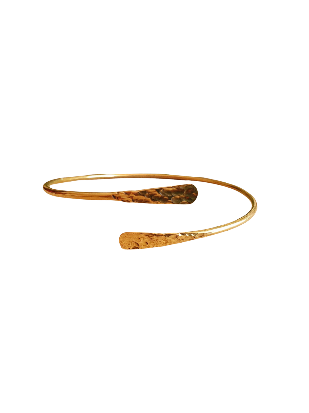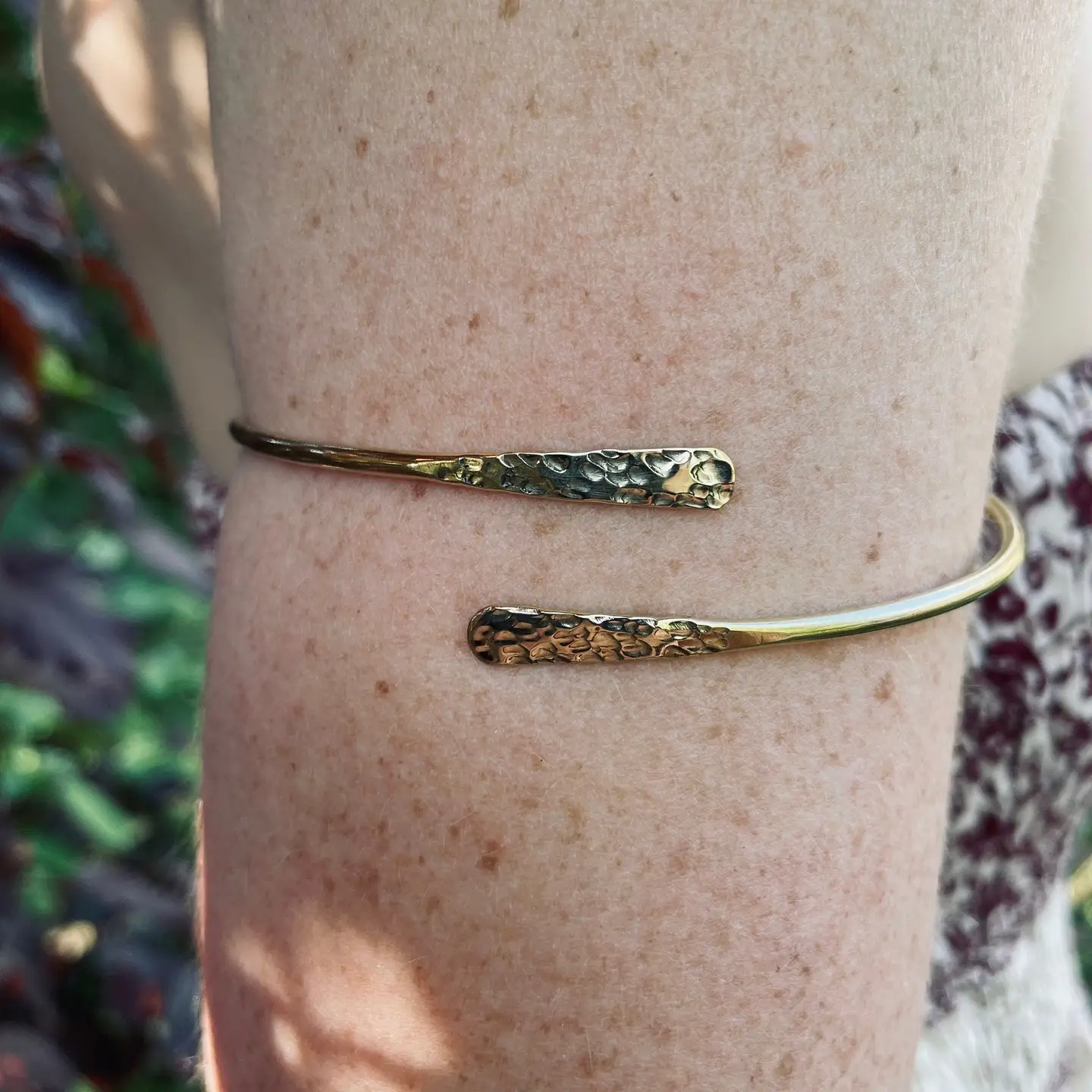 Beautiful spiral arm bracelet with a hammered brass effect, offering a comfortable fit and sparkling style.