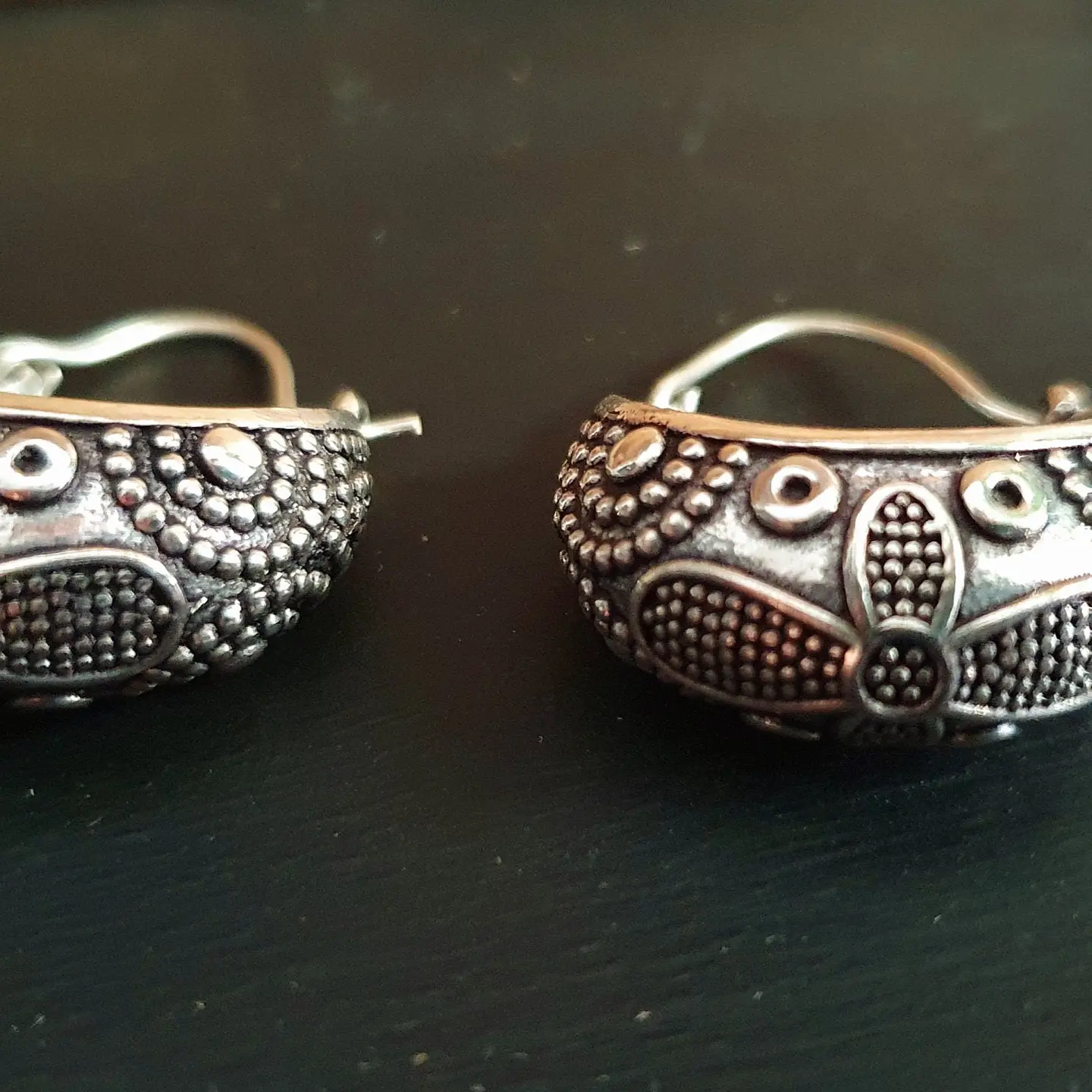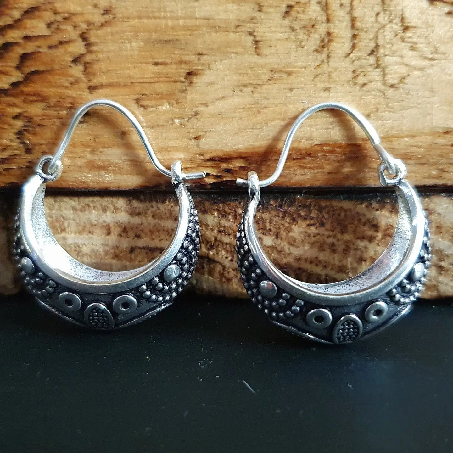 Bold silver-toned hoop earrings with beautiful tribal detailing — perfect for adding character to any look.