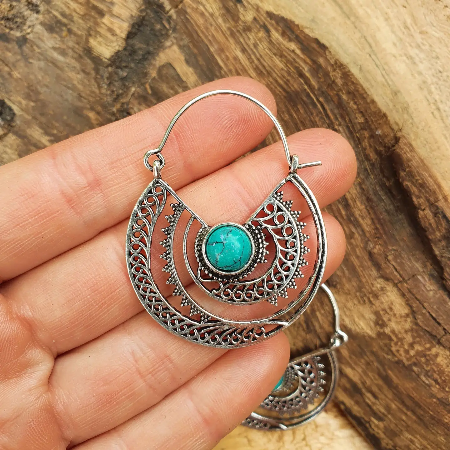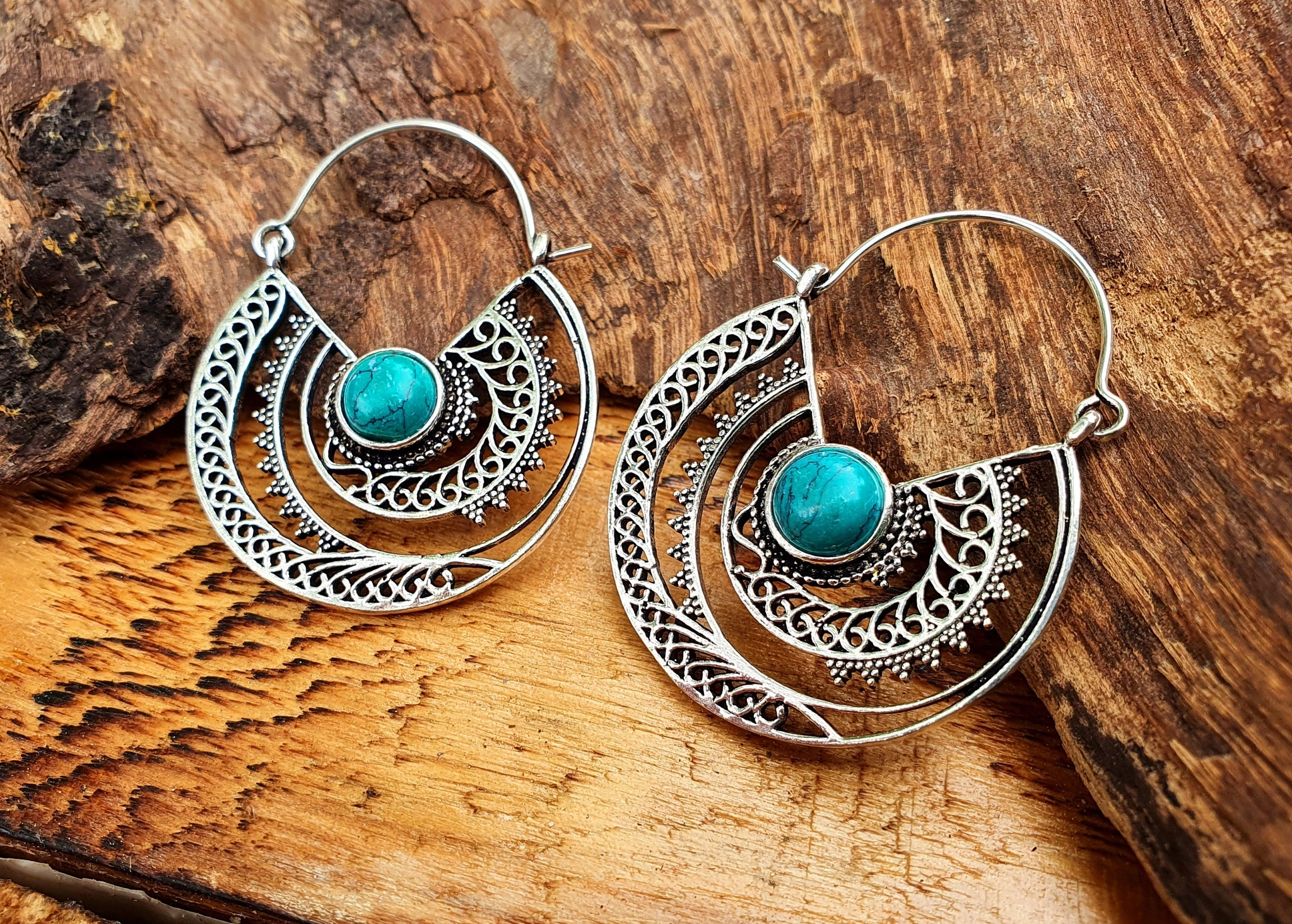 Pair of silver plated & turquoise hoop earrings. High quality silver plated, lightweight and 100% nickel free.