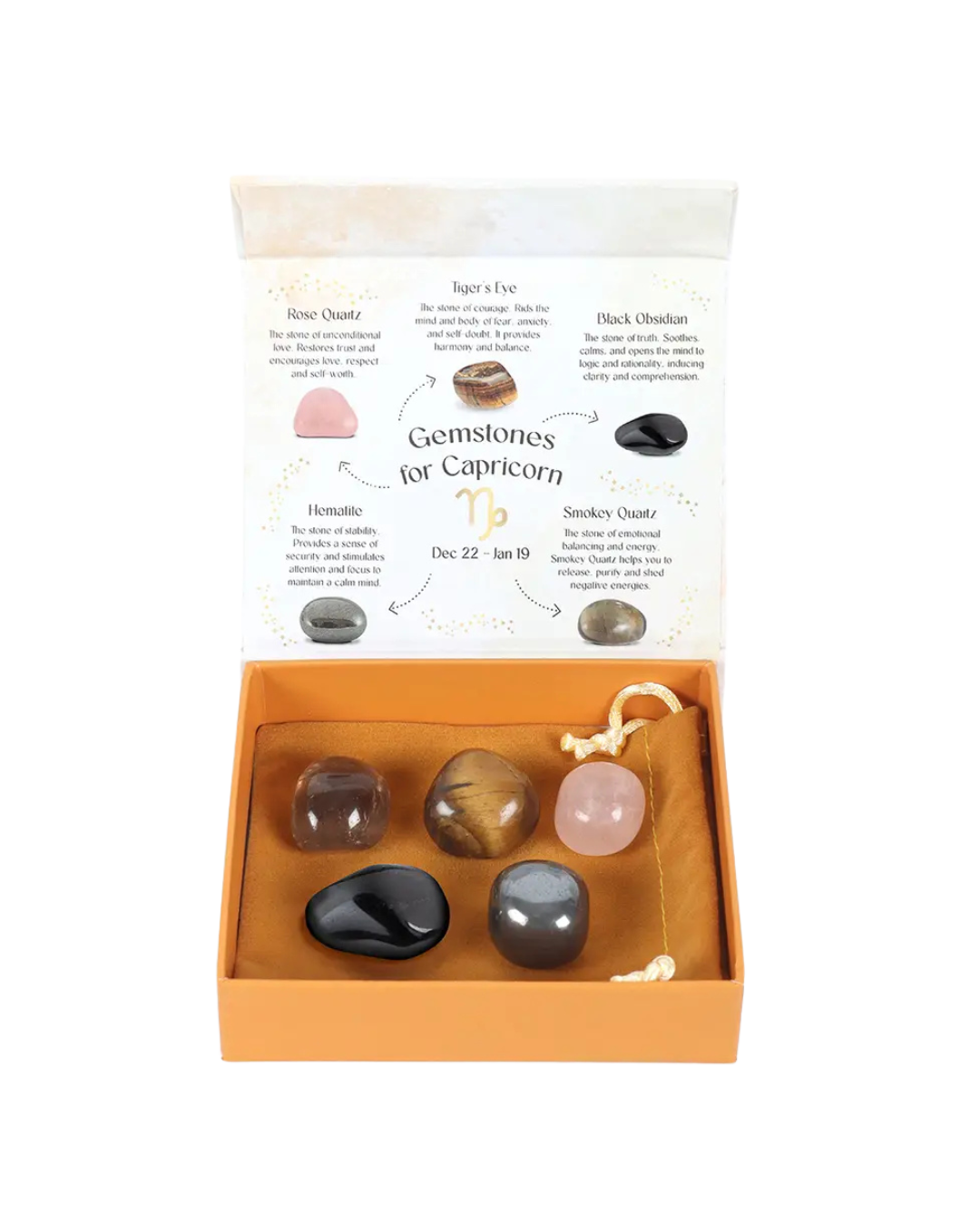 This stunning set of five crystal tumblestones is perfect for the ambitious, responsible, and independent Capricorn.