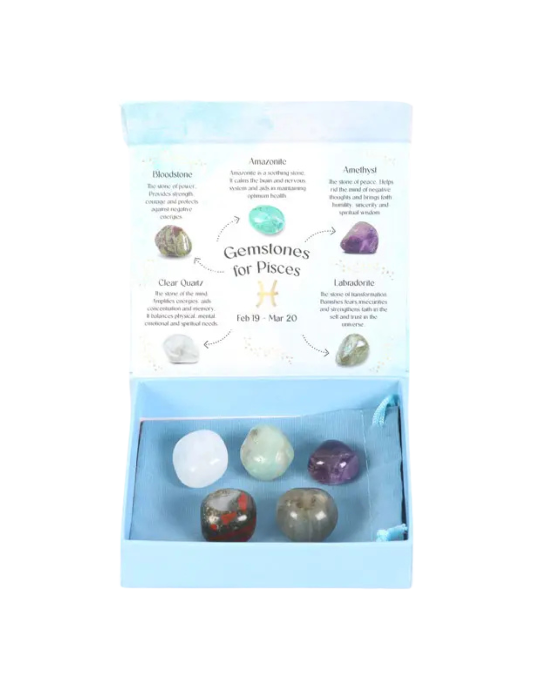 A beautiful set of five crystal tumblestones chosen for the wise, creative, and deeply intuitive Pisces.