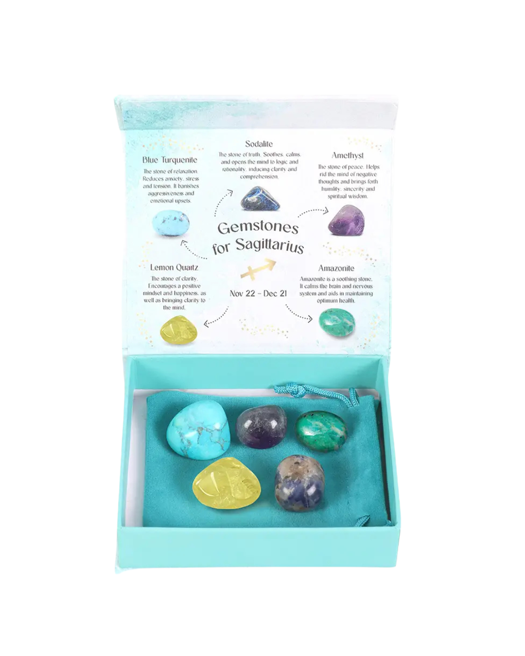 This stunning set of five crystal tumblestones is perfect for the optimistic, lively, and fair-minded Sagittarius.